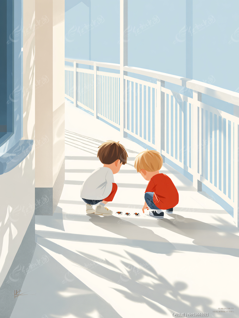 两个小学生在研究地上蚂蚁开学季卡通插画