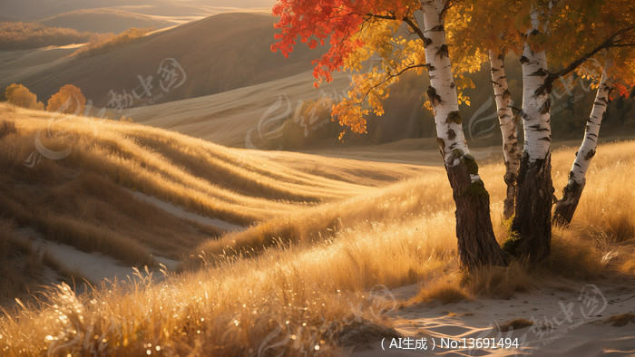 秋天的草地与白桦树