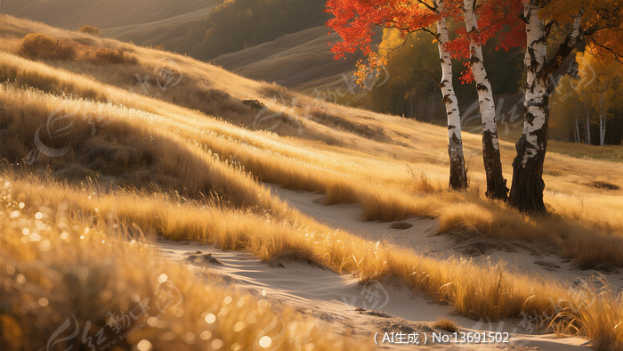 秋天的草地与白桦树