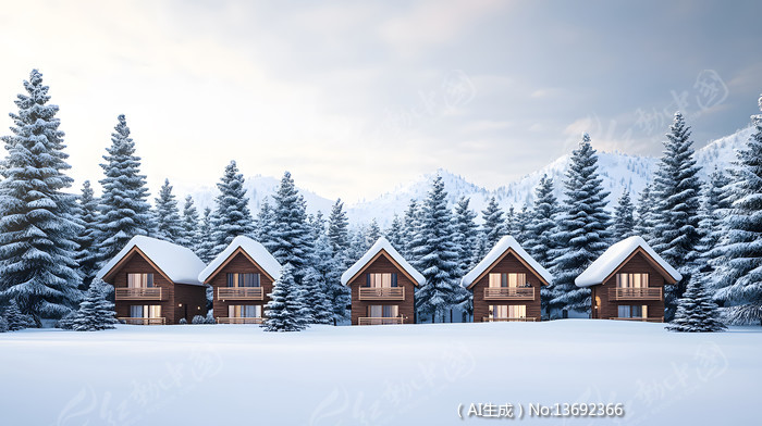 冬天白雪覆盖树林中的民宿村庄风景图片