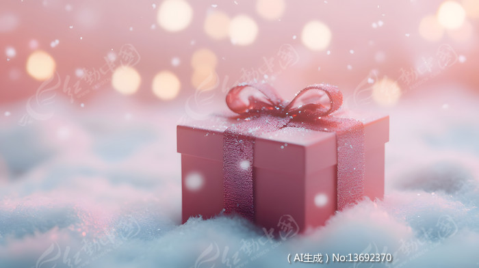 一个红色礼物在白雪覆盖的雪地上图片