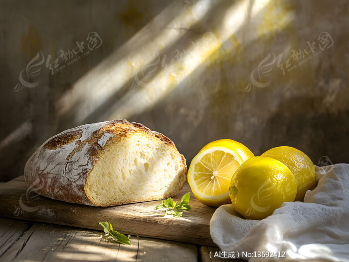 墙边木板上柠檬和面包食物图片