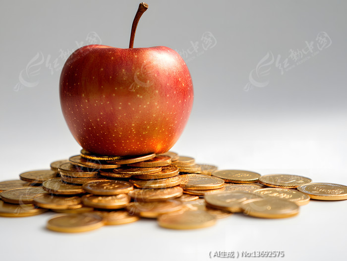 在一堆金币上的一个红苹果水果图片