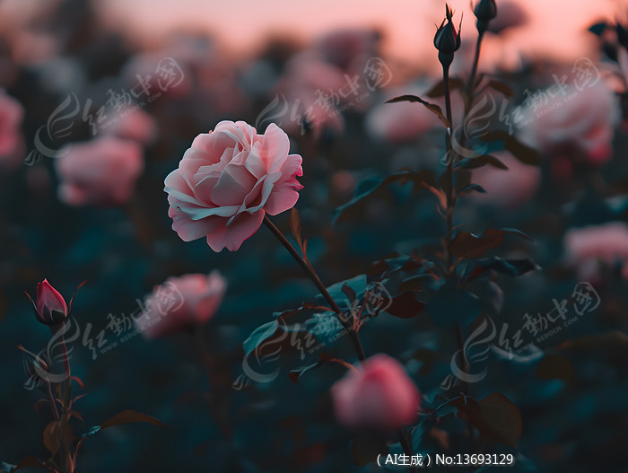 黄昏傍晚特写粉色玫瑰花田的花枝植物图片