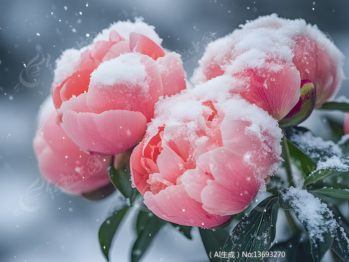 冬天下雪天白雪覆盖的粉色牡丹花花卉图片
