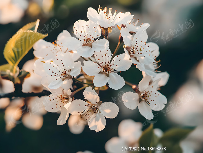 傍晚黄昏霞光照耀白色樱花花卉图片