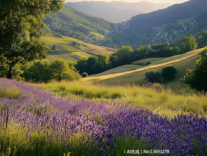 茂盛山谷中一片紫色薰衣草花丛花卉图片