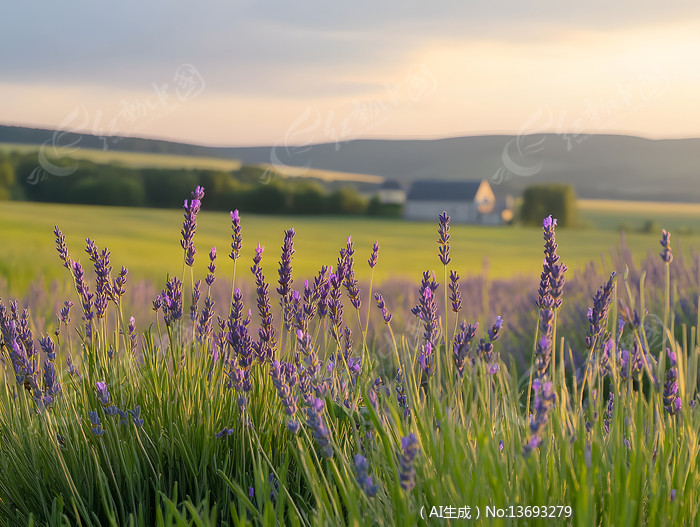 傍晚黄昏夕阳草原上一片紫色薰衣草花丛图片