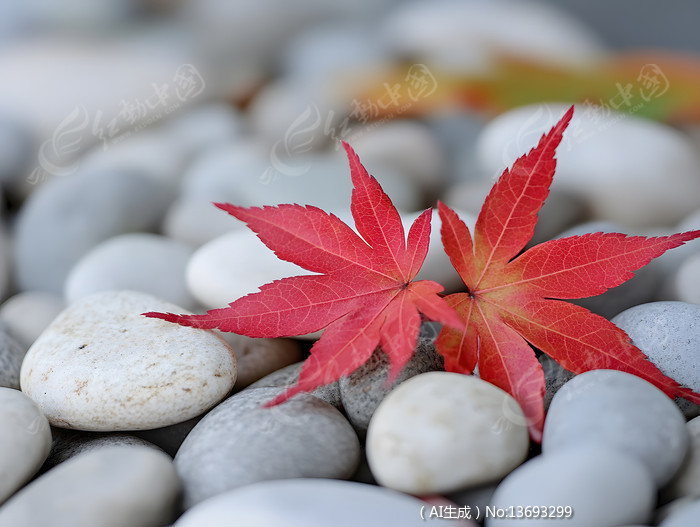 掉落在鹅卵石上的两片红色枫叶叶子植物图片