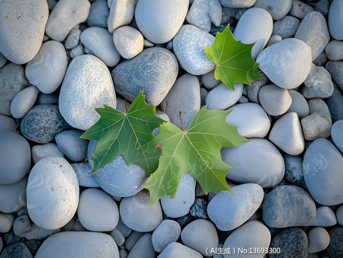 绿色枫叶树叶掉落在鹅卵石上叶子图片