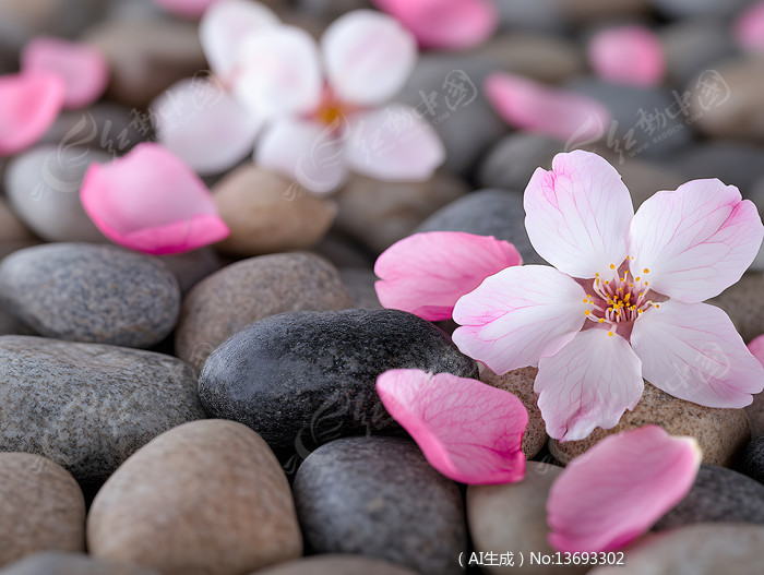掉落在鹅卵石上粉色樱花花瓣花卉图片