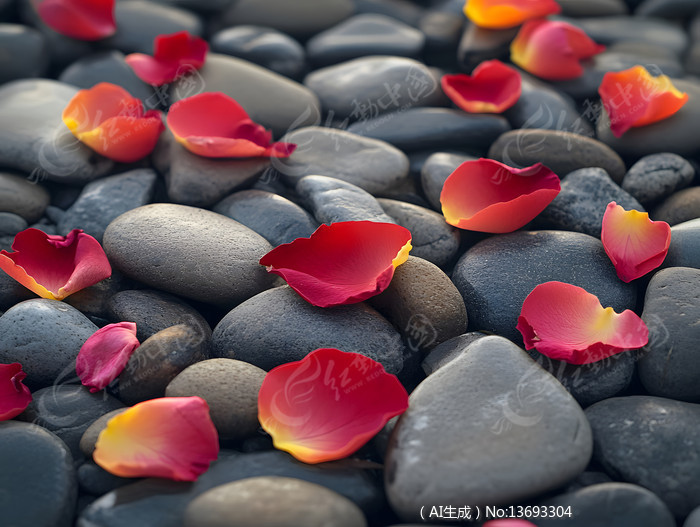 红色玫瑰花花瓣掉落在鹅卵石上花卉图片