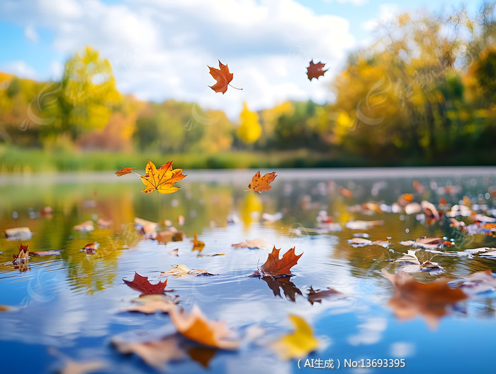特写水面有飘落的枯萎枫叶