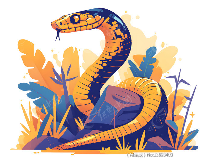 黄紫色草丛石头上有一条蛇十二生肖动物插画