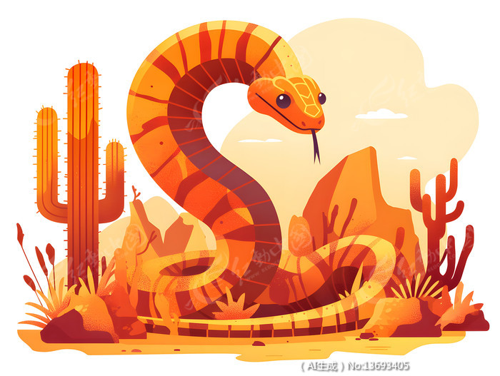 一条黄色的蛇爬行在有仙人掌的草地动物插画