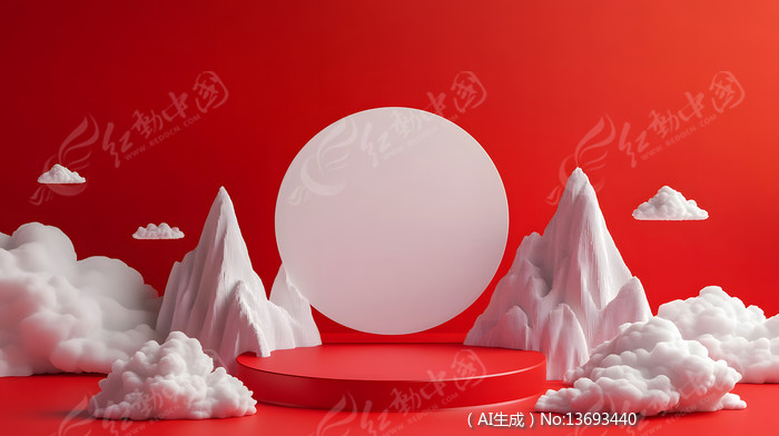 抽象立体山脉白云红色背景电商展示台