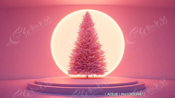 粉紫色圆形光圈前杉树电商展示舞台背景图