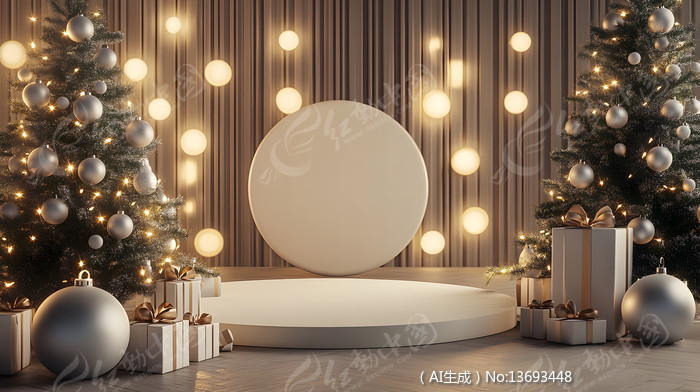 亮光彩灯和挂着圆球的圣诞树电商展示舞台