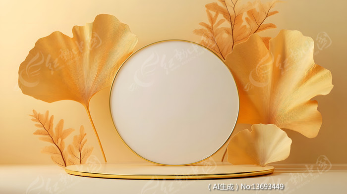 抽象立体黄色银杏树叶围绕电商展示舞台图片