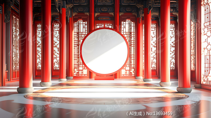 阳光照耀红色柱子木建筑室内电商展示舞台