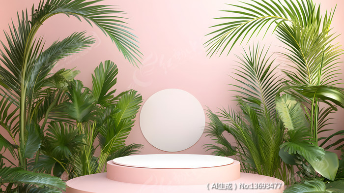 电商展示舞台被绿色棕榈树叶围绕背景图