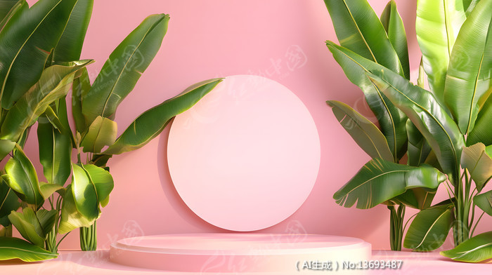 绿色芭蕉叶围绕粉红色电商展示舞台背景图