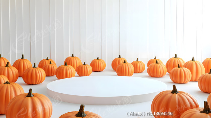 一堆成熟南瓜围绕白色电商展示舞台背景图