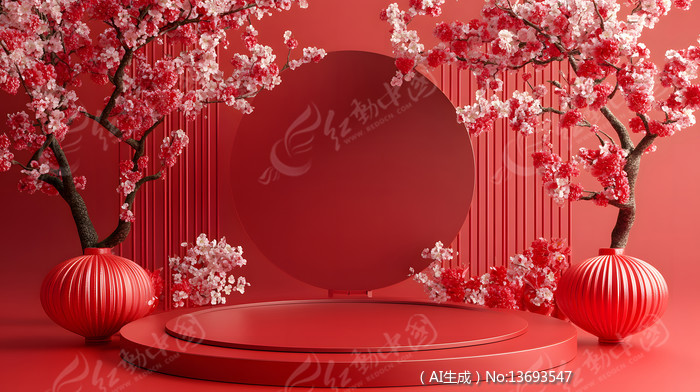 红色梅花花枝和灯笼围绕电商展示舞台背景图