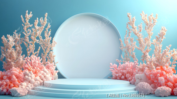 粉色珊瑚礁围绕圆形平台蓝色电商展示舞台