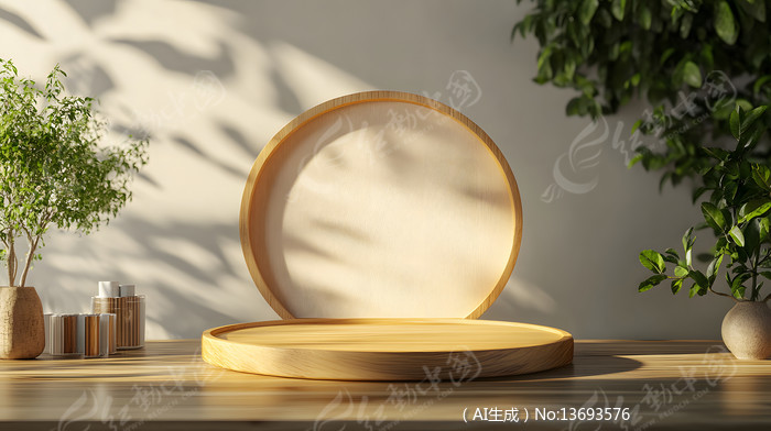 绿叶在金色圆形平台旁电商展示舞台背景图