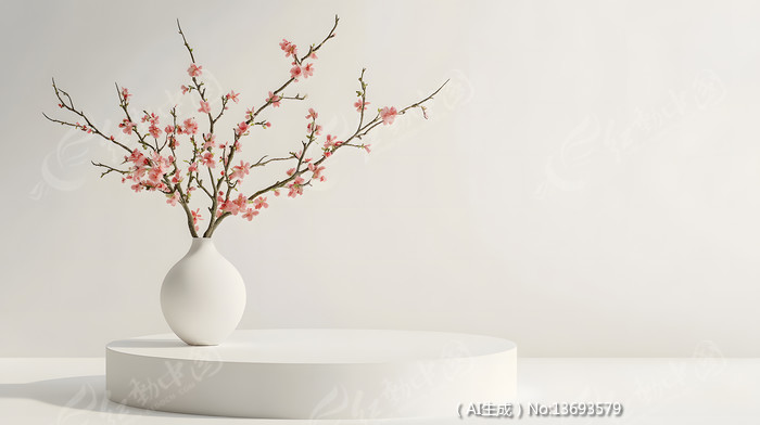 插着桃花花枝的花瓶在圆形平台电商展示舞台