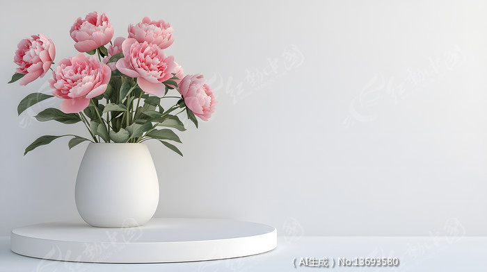 插着粉色牡丹花花枝在圆形平台电商展示舞台