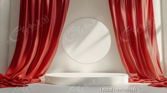 垂挂着红色绸缎布帘的电商展示舞台背景图