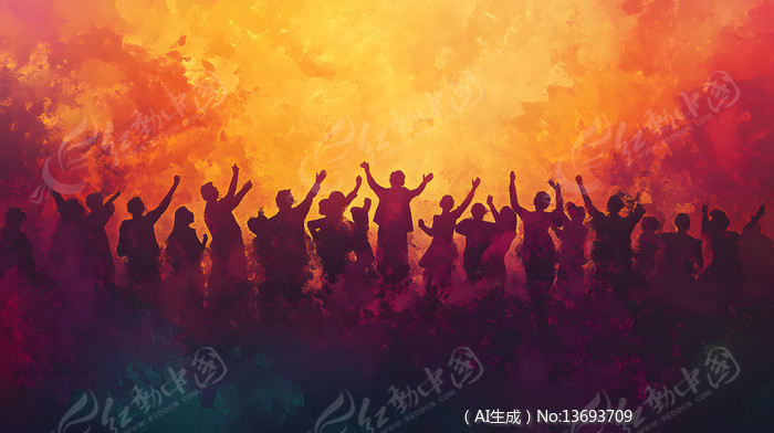 梦幻橘黄色欢呼的人群剪影抽象背景图片