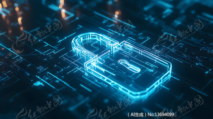 蓝色线条描绘一个锁科技感保护盾主题背景