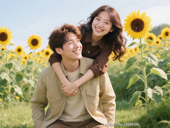 葵花田前的一对年轻情侣