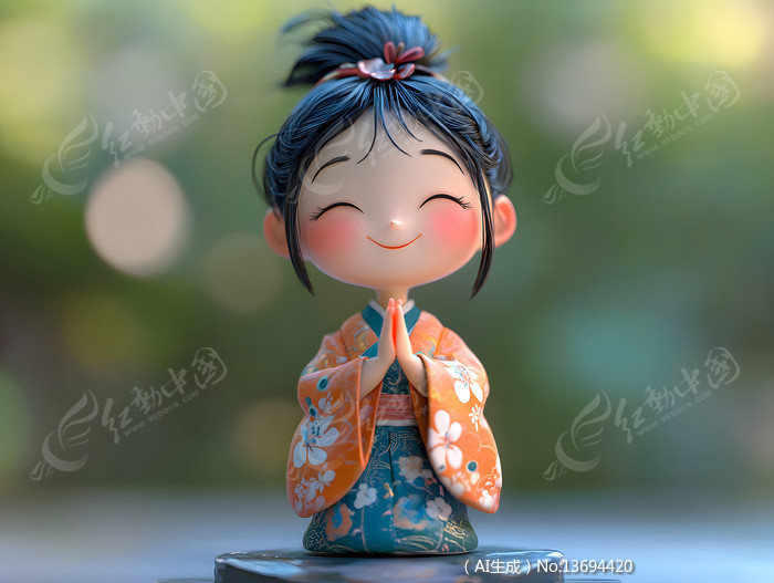 一个穿着汉服的小女孩跪坐双手合十姿势