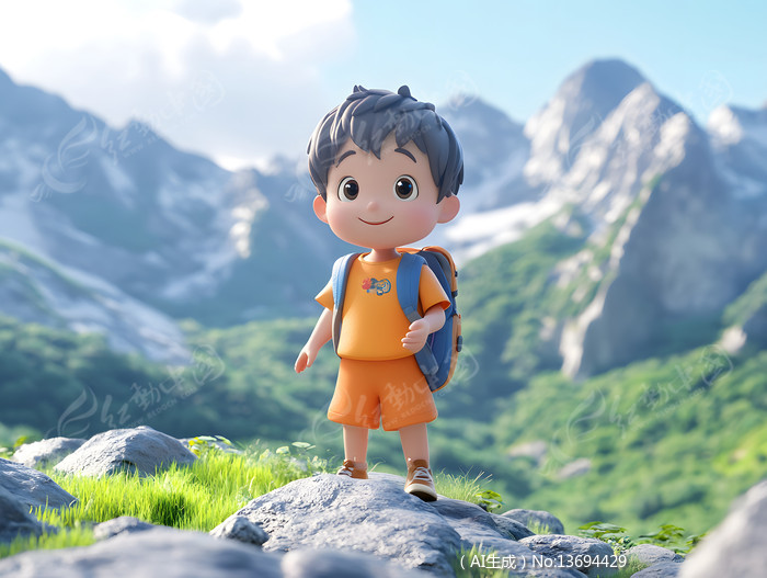背着旅行包的卡通可爱小男孩站在山顶上