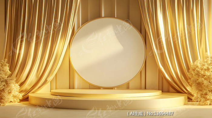 金黄色窗帘布帘围绕几何圆形电商展示舞台