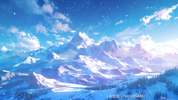 蓝天白云冬季手绘冰川雪地白雪覆盖卡通插画