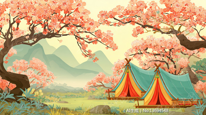 樱花树下草地帐篷度假手绘扁平国潮风插画