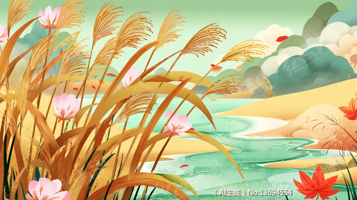手绘国潮风湖边芦苇荡植物风景扁平插画