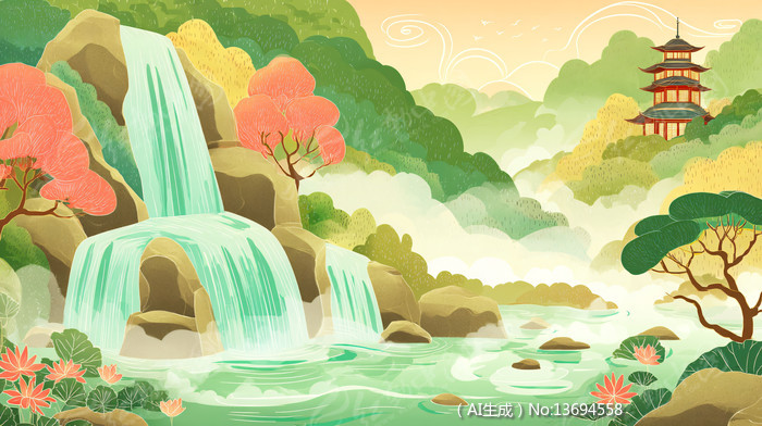 手绘国潮风山谷中瀑布河流风景扁平插画