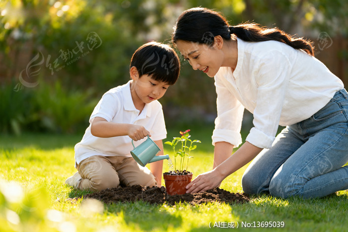 植树节母子共赏绿植浇水瞬间