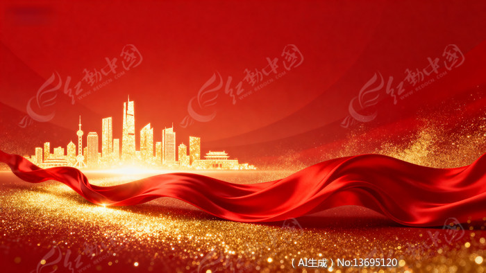 红绸飘拂下的璀璨城市背景