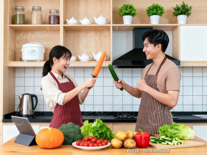 在厨房用食材佯装对战的情侣
