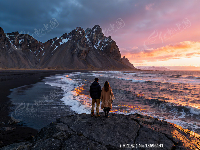 冰岛黑沙滩上的一对情侣