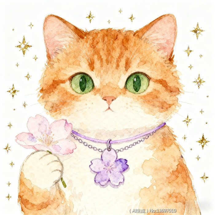 持花橘猫主题的水彩画