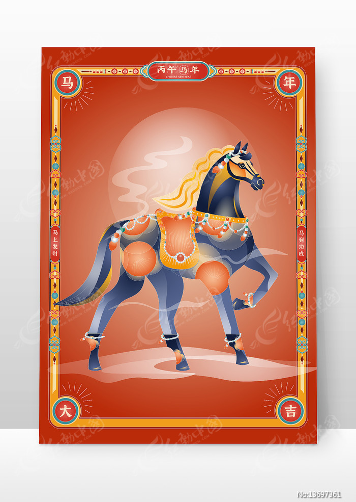原创2026丙午马年生肖青色骏马吉祥插画图片下载_红动中国