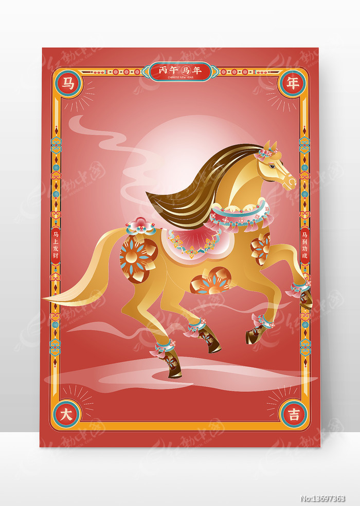 原创2026丙午马年生肖黄色骏马吉祥插画图片下载_红动中国
